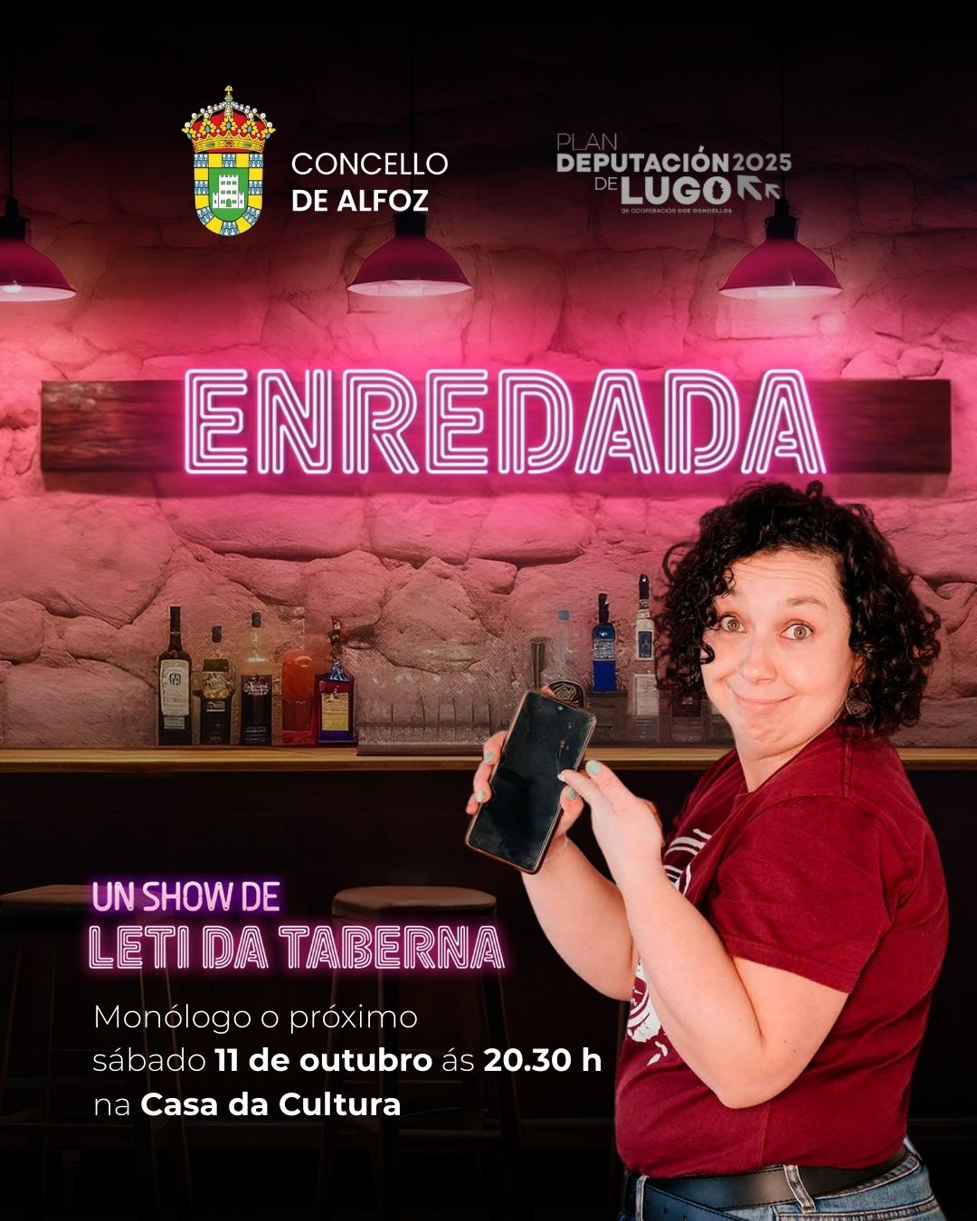 O vindeiro sábado 11 de outubro temos unha cita coa risa da man de Leti da Taberna e o seu monólogo “Enredada”, un espectáculo cheo de retranca e moi bo rollo. Hora: 20:30 h Lugar: Casa da Cultura Non volo perdades!