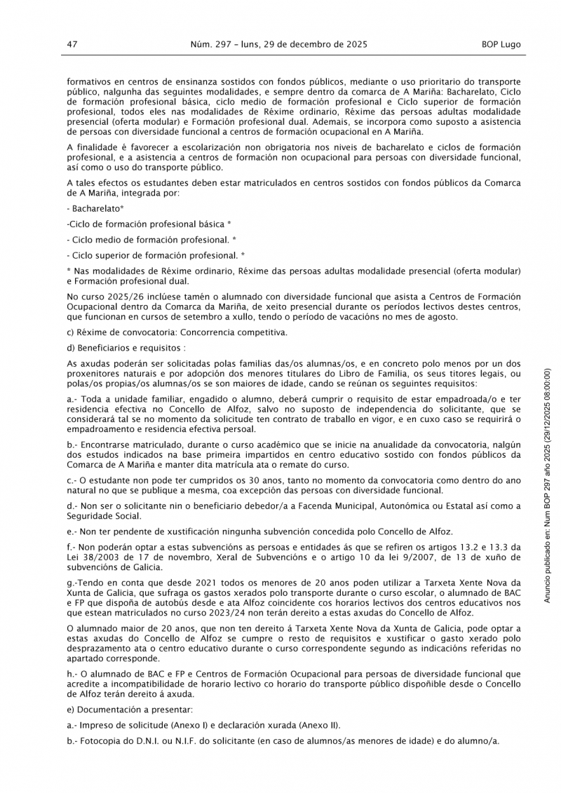 O Concello de Alfoz abre o prazo para solicitar as axudas ao transporte de estudantes que cursen Bacharelato e ciclos de Formación Profesional fóra do termo municipal, en centros sostidos con fondos públicos da comarca da Mariña.