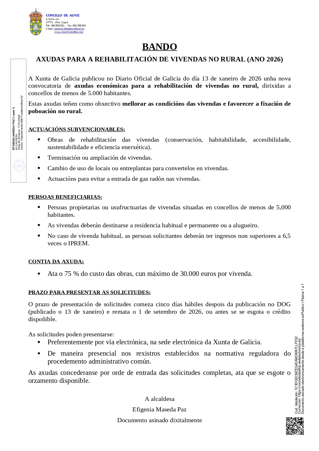 A Xunta de Galicia publicou no Diario Oficial de Galicia do día 13 de xaneiro de 2026 unha nova convocatoria de axudas económicas para a rehabilitación de vivendas no rural, dirixidas a concellos de menos de 5.000 habitantes.