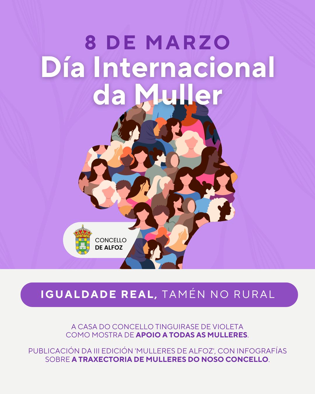 - Publicarase a III edición de “Mulleres de Alfoz”, con infografías que recollen a traxectoria de mulleres do noso concello, poñendo en valor o seu papel na vida social, cultural e profesional.