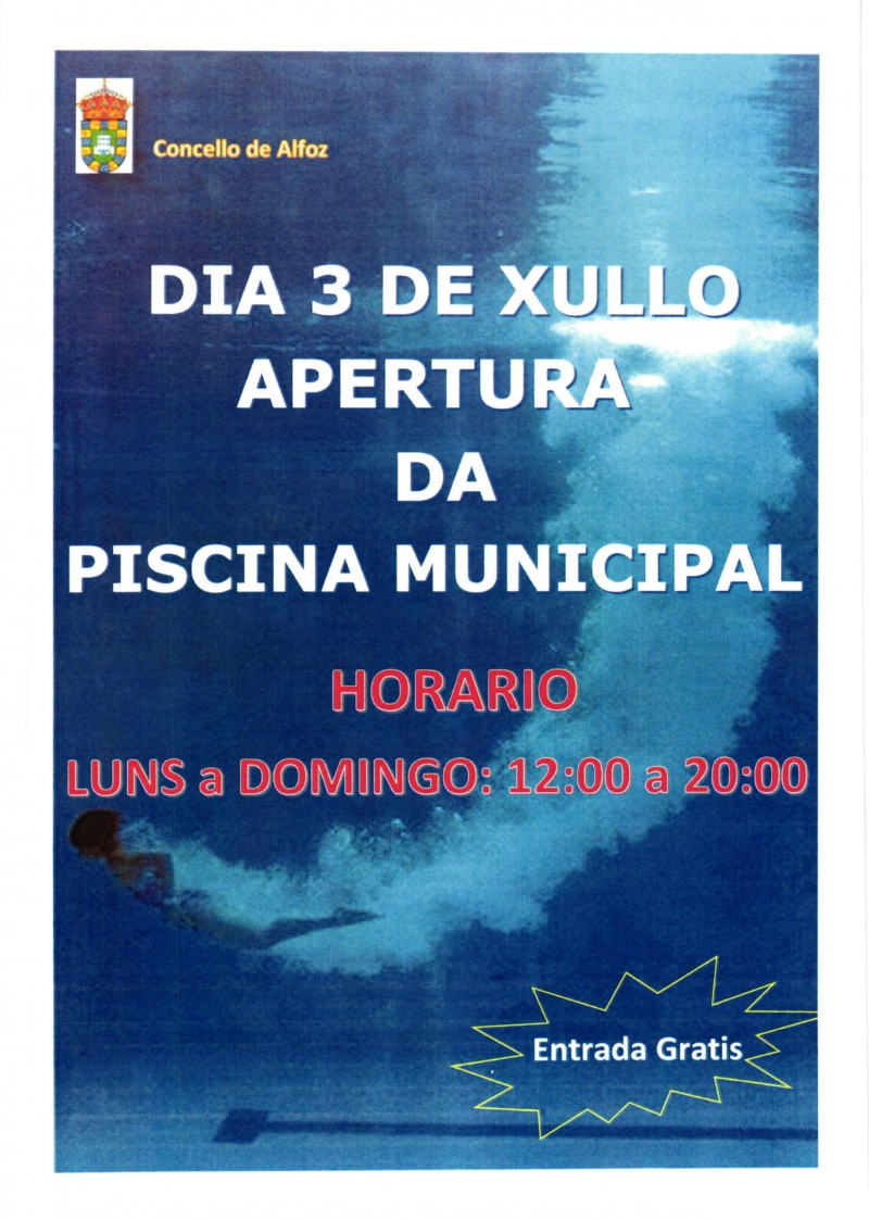 - Piscina Municipal: de luns a domingo de 12.00 a 20.00 horas (entrada gratuíta).