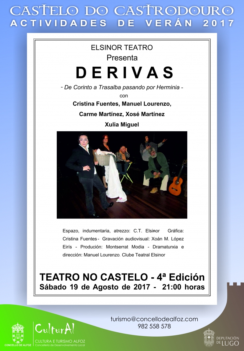 Dentro da programación de verán do Concello de Alfoz enmárcase a representación de Derivas, que realizará a compañía Elsinor Teatro, escrita e dirixida por Manuel Lourenzo. A obra que se exhibe o vindeiro 19 de agosto no Castelo de Castrodouro, está interpretada por: Cristina Fuentes, Carmen Martínez, Xosé Martínez, Xulia Miguel e o propio Manuel Lourenzo, e ten unha duración de 70 minutos.