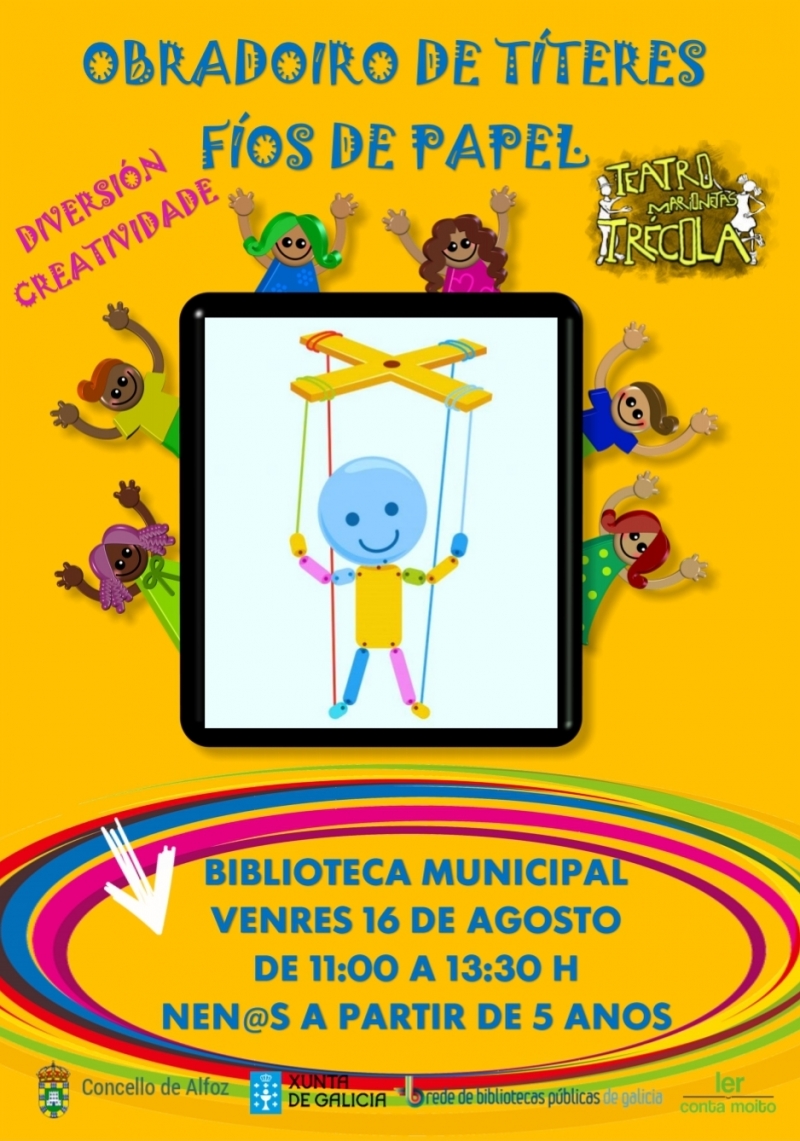 Venres 16 de agosto de 11.00 a 13.30 horas na biblioteca municipal, Obradoiro de Títeres para nenos a partir de 5 anos.