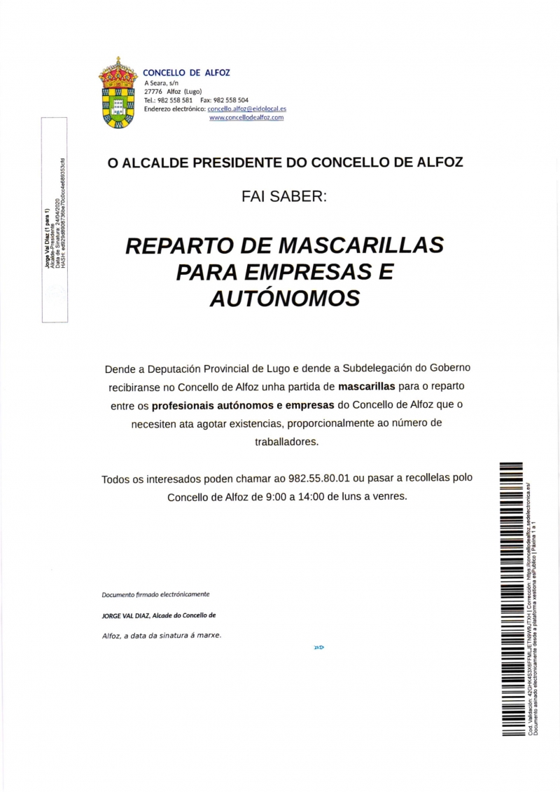 Dende a Deputación Provincial de Lugo e dende a Subdelegación do Goberno recibiranse no Concello de Alfoz unha partida de mascarillas para o reparto entre os profesionais autónomos e empresas do Concello de Alfoz que o necesiten ata agotar existencias, proporcionalmente ao número de traballadores.