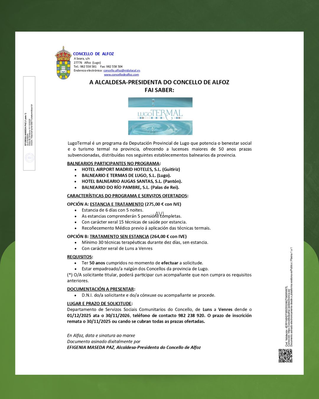 El Concello de Alfoz informa de la puesta en marcha del Programa Lugo Termal 2025–2026, promovido por la Diputación de Lugo con el objetivo de potenciar el benestar social y el turismo termal de la provincia. El programa ofrece plazas subvencionadas para personas mayores de 50 anos, distribuídas en los siguientes establecimientos balnearios: