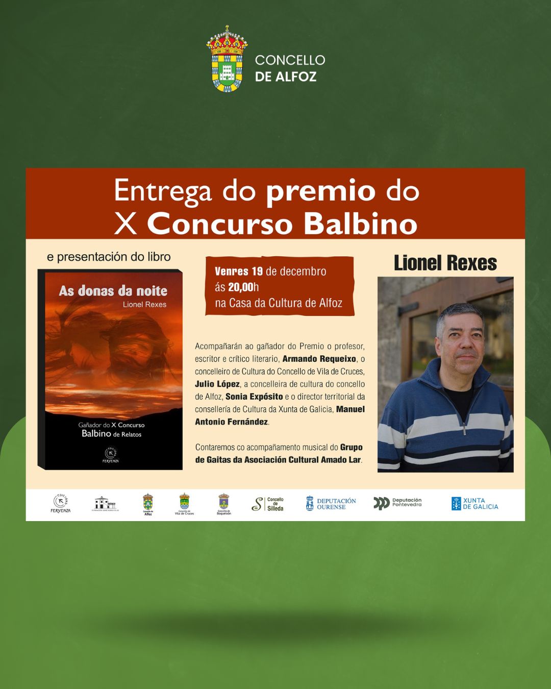 Este viernes, 19 de diciembre, celebramos en Alfoz a entrega del premio del X Concurso Balbino de Relatos y la presentación del libro “Las doñas de la noche”, obra ganadora de nuestro vecino Lionel Riges.