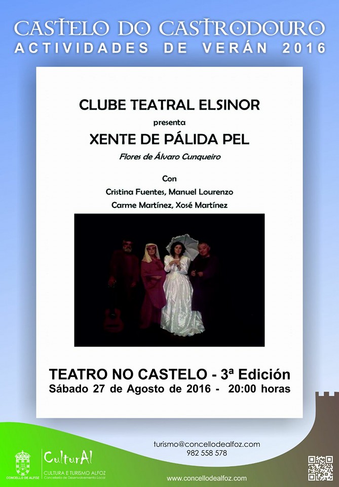 El Club Teatral Elsinor de A Coruña repetirá por segundo año consecutivo y después de la interpretación de "Medea" y "A técnica do Taratantaleo" el verano pasado, serán los encargados de presentarnos la obra "Xente de pálida pel", con actores tan conocidos como Manuel Lourenzo, Cristina Fuentes, Xosé Martínez y Carme Martínez. La entrada será gratuita.