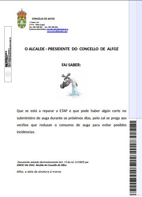 El Alcalde-Presidente del Ayuntamiento de Alfoz hace saber que se está a reparar la ETAP y que puede haber algún corte en el subministro de agua durante los próximos días, por lo cual se ruega a los vecinos que reduzcan el consumo de agua para evitar posibles incidencias.