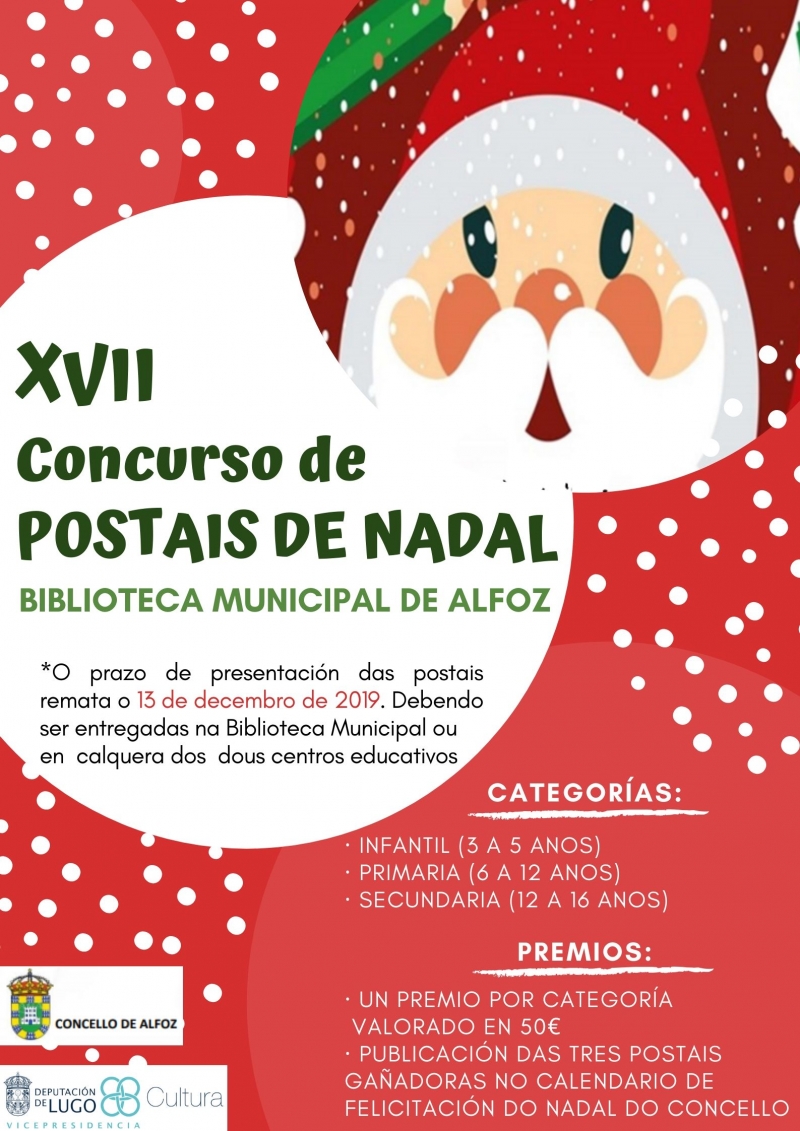 Concurso de Postales de Nmavidad en el que podrán participar todos los alumnos y alumnas matriculados en los centros educativos del ayuntamiento (CEIP o IES) que deberán presentar sus postales con motivos relacionados con la Navidad en la Biblioteca Municipal o en cualquiera de los centros educativos.