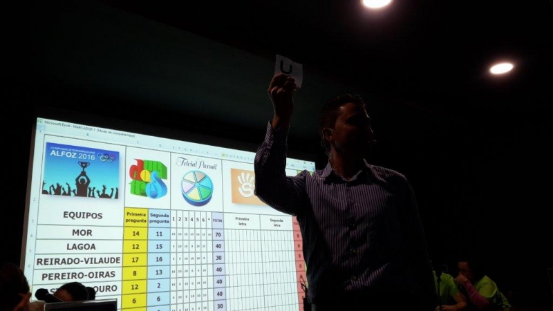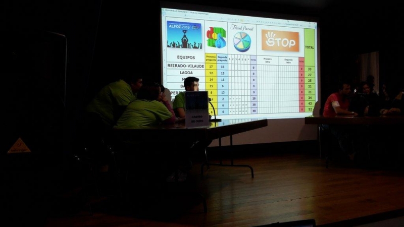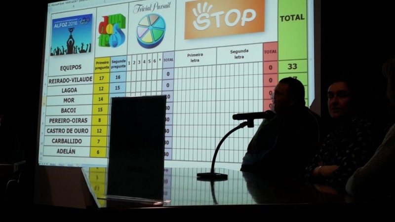 Un año más, el Salón de Actos del Centro Sociocultural de Alfoz se hizo pequeño para albergar a toda la gente que presenció y participó en la primera jornada de las III Olimpiadas Interparroquiales de Alfoz, celebrada el pasado sábado. En esta jornada se desenvolvieron las pruebas culturales, formadas por los clásicos juegos del Un dos tres, Trivial y Stop. En esta primera prueba el equipo ganador fue el representante de la parroquia de Castro de Ouro, que después de un mal inicio pudo remontar en el juego del Stop, juego en el que las parroquias de Mor y Bacoi tuvieron la suerte de espaldas al tocarles participar con la fatídica letra “ñ”, verdadero “antichollo” de este juego.